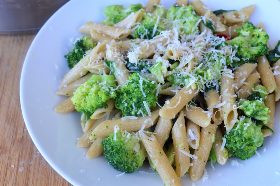 Añadimos el brócoli, las espinacas y la pasta recién escurrida y al dente (importantísimo), mezclamos bien y ponemos sal y pimienta al gusto y rallamos parmesano.