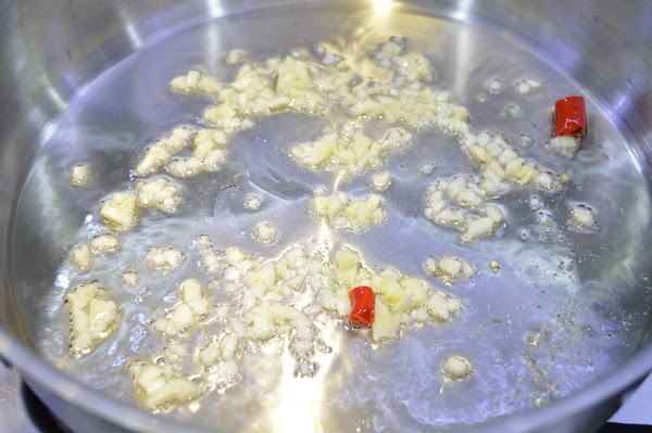 Mientras se hace la pasta cogemos una cacerola, ponemos el aceite, el ajo picado y la guindilla y sofreímos un poco.