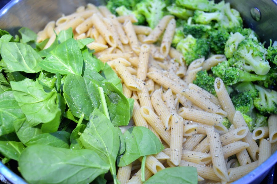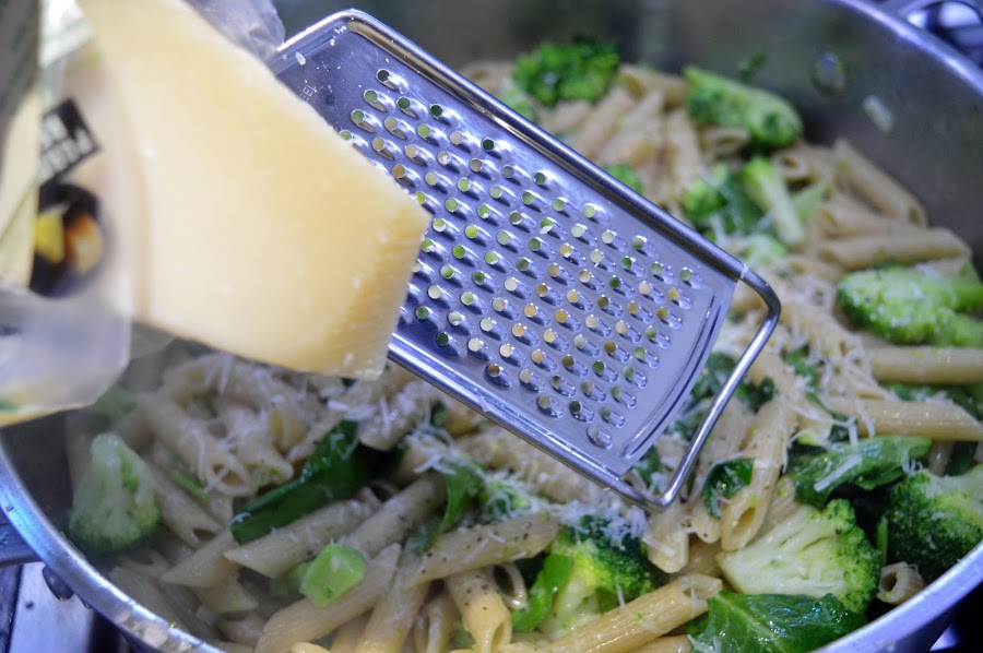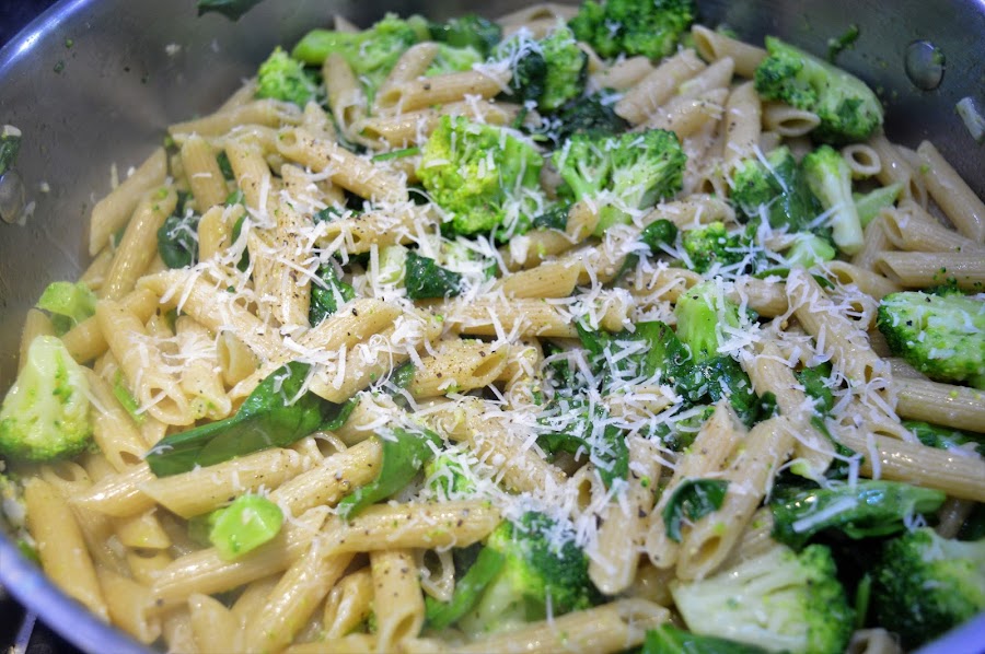 Añadimos el brócoli, las espinacas y la pasta recién escurrida y al dente (importantísimo), mezclamos bien y ponemos sal y pimienta al gusto y rallamos parmesano.