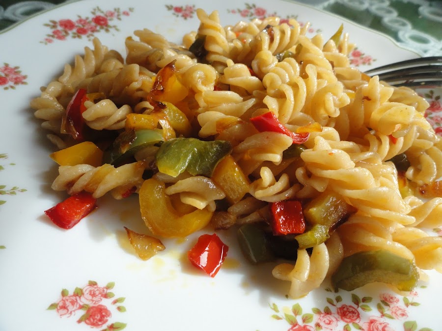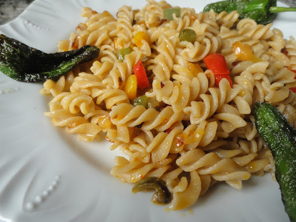 Ponemos a calentar el aceite y doramos la cebolla cortada en daditos, no demasiado pequeños, y agregamos los tres tipos de pimiento igualmente troceados, la media guindillita cayena y dejamos sofreir todo junto. Cuando esté el sofrito incorporamos la pasta, sal, damos unas vueltecitas y servimos acompañados de unos pimientos de padrón. Si queréis un plato más completo le iría bien un poco de atún o melva en aceite.