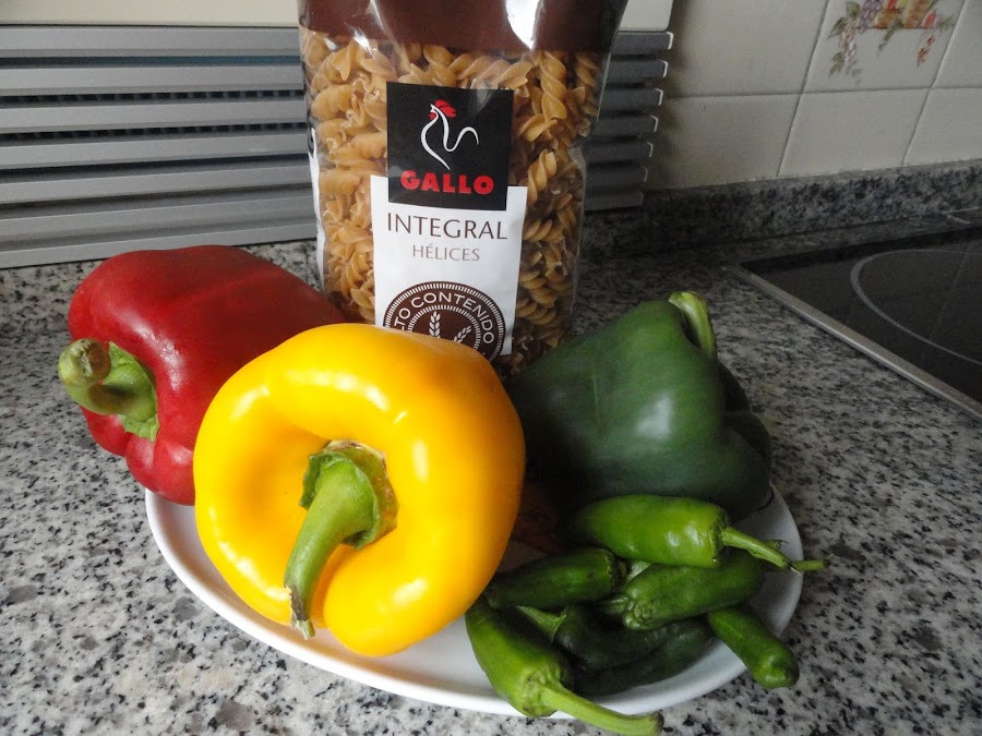 Para darle colorido a la pasta integral que incluía mi caja DISFRUTABOX de este mes he preparado estas hélices de pastas GALLO, con alto contenido en fibra y que hemos alegrado con los pimientos verde, rojo y amarillo...