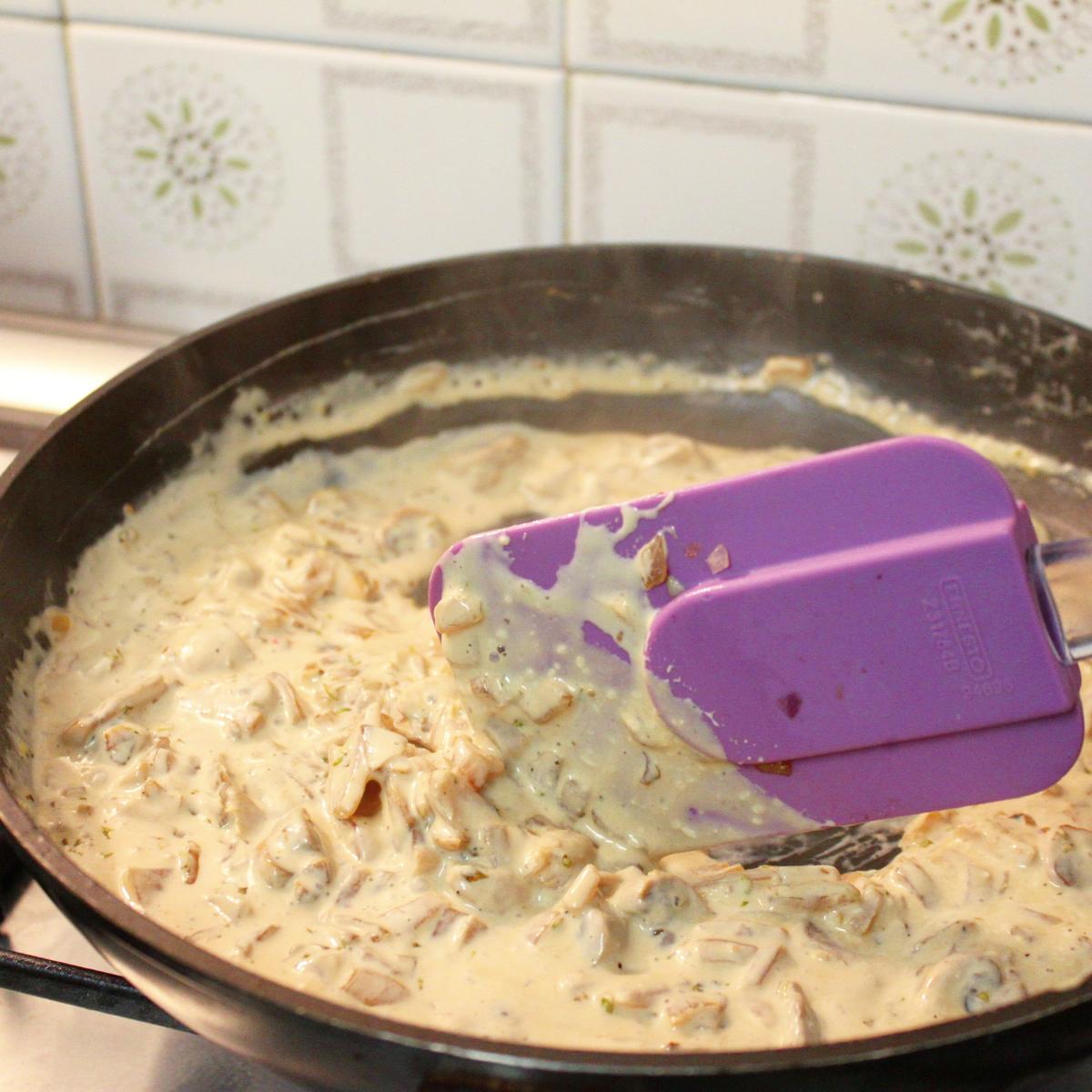 Añadir la mitad de la nata (crema de leche) vegetal, remover constantemente y añadir el caldo vegetal, esto ayudará a que la salsa siempre esté jugosa y no sea muy pesada. Dejar cocer 5 minutos y remover constantemente.