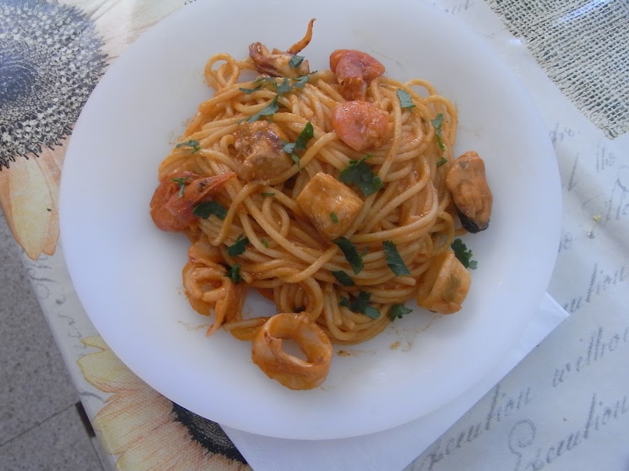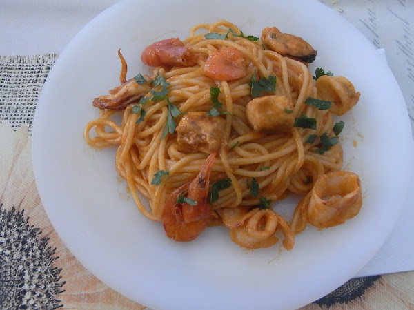 Cuando los espagueti estén listos se escurren y se vuelcan sobre el sofrito, se le da a todo una vuelta para que quede toda la pasta impregnada del sofrito y se espolvorea con perejil fresco cortado muy fino.