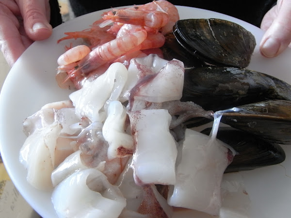 Es muy simple lleva gambitas, mejillones, calamares, trocitos de atún y de emperador ... lo que os guste. A mí me gusta ponerle los mejillones frescos, abiertos a parte, pero si los ponéis congelados os ahorráis el tener que limpiarlos y abrirlos en un cazo a parte, aunque yo lo prefiero.