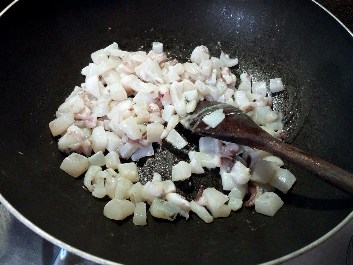 Calentar la sartén, sin añadir nada más de aceite y cocer rápidamente (la sepia cómo los calamares, tienen un tiempo de cocción muy breve, entre 30-40 segundos) a fuego vivaz.