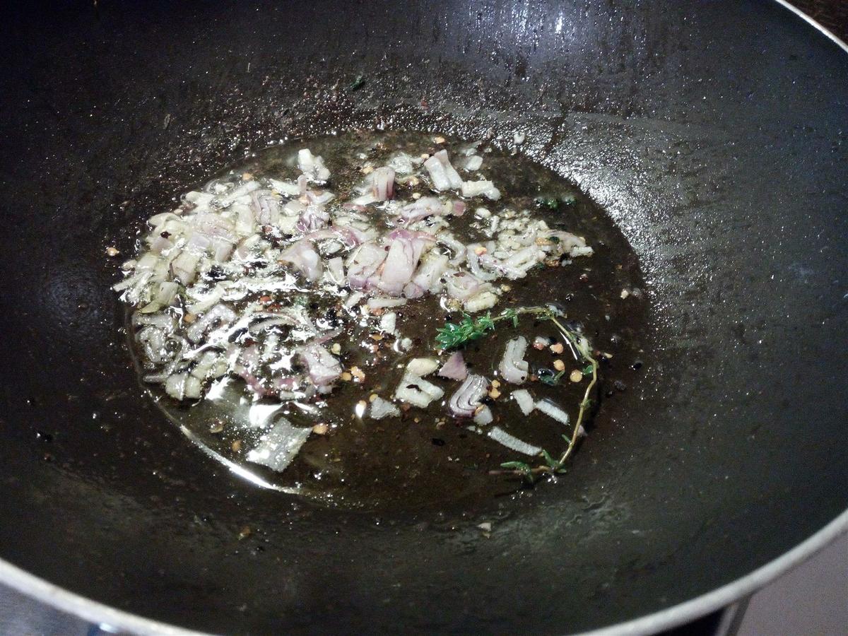 En la misma sartén, poner un poco de aceite, picante, tomillo y chalote picado.