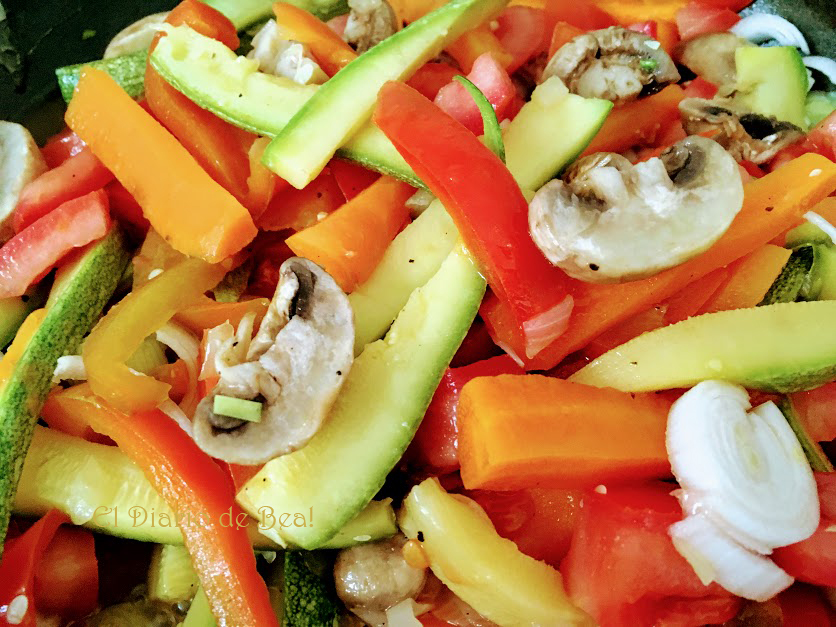 Calentar el sartén y agregar aceite, 1 cucharada es suficiente , no vamos a freír agregar la cebolla y el ajo, rehogar, comenzamos por las verduras que son más duras como la zanahoria , la calabaza, luego le agregamos los champiñones y el pimiento, salpimentar, dejamos cocinar unos minutos tapado y es hora de incorporar los tomates, la cebollita, dejamos para ultimo momento los tallos de la cebollita cambray y la albahaca. Si es necesario agrega un poco de agua, la idea es que la verduras queden cocidas pero crujientes.