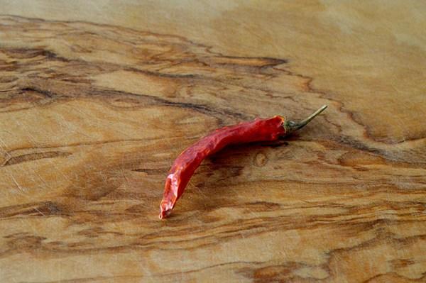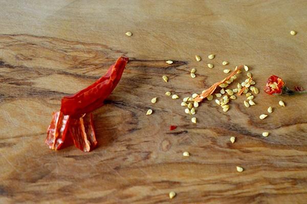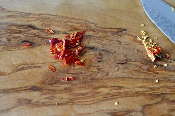 Eliminamos las pepitas de la guindilla seca y la troceamos.