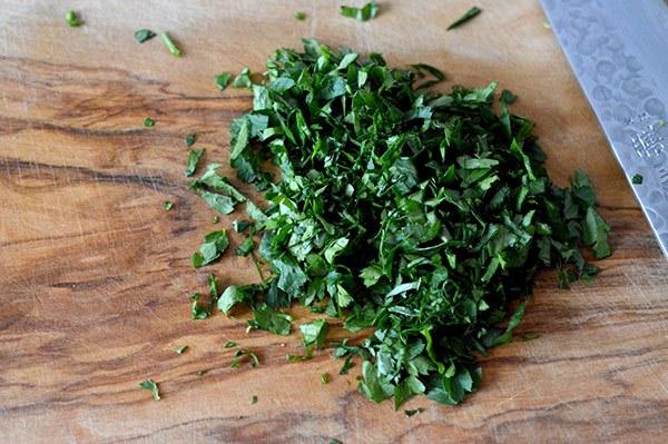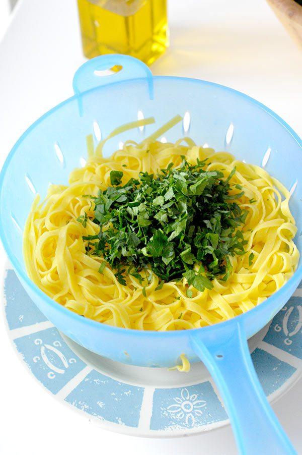 Retiramos la pasta una vez cocida y añadimos un chorrito de aceite y las hojas de perejil picado.