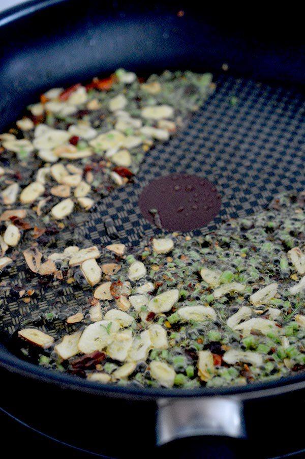 Añadimos el ajo, los tallos de perejil y la guindilla. Doramos.