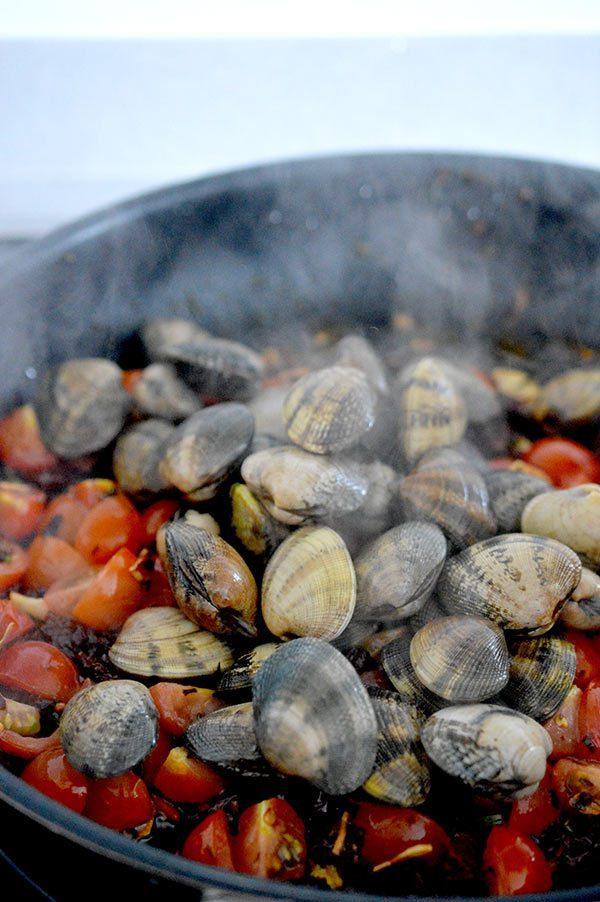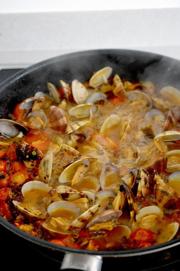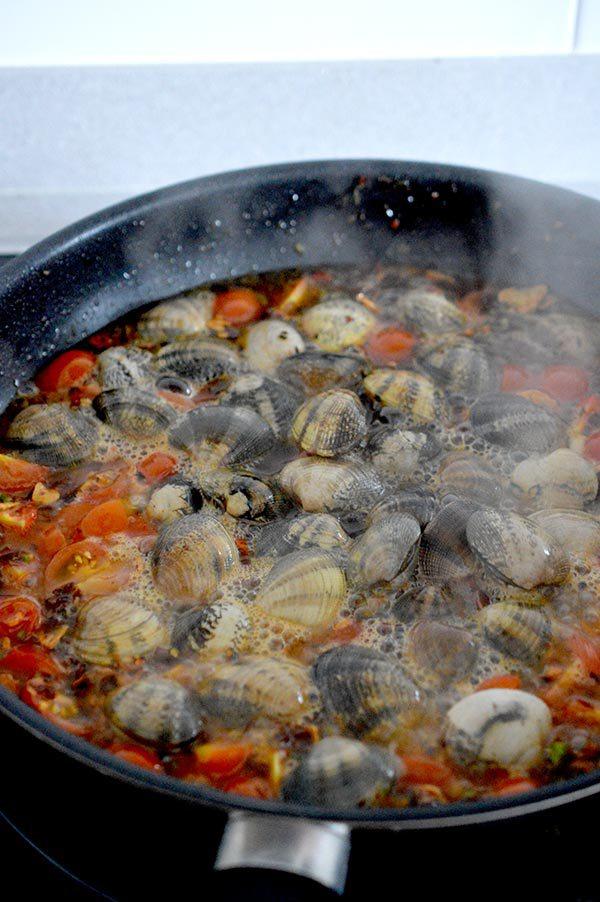 Añadimos el vino y tapamos para que se abran las almejas. Cocinamos 5 minutos mas.
