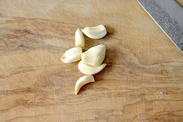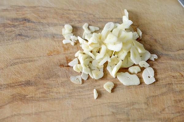 Comenzamos con el ajo, lo pelamos y picamos en laminas