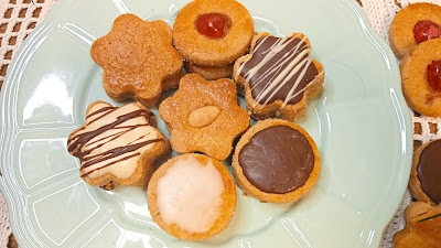 Pincelamos con el huevo batido, en algunas espolvoreamos por encima un poco de la mezcla del azúcar y canela, en otras ponemos una almendra y en otras una guinda por la mitad. El resto las dejamos para hacer el glaseado y la cobertura.