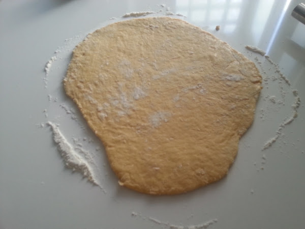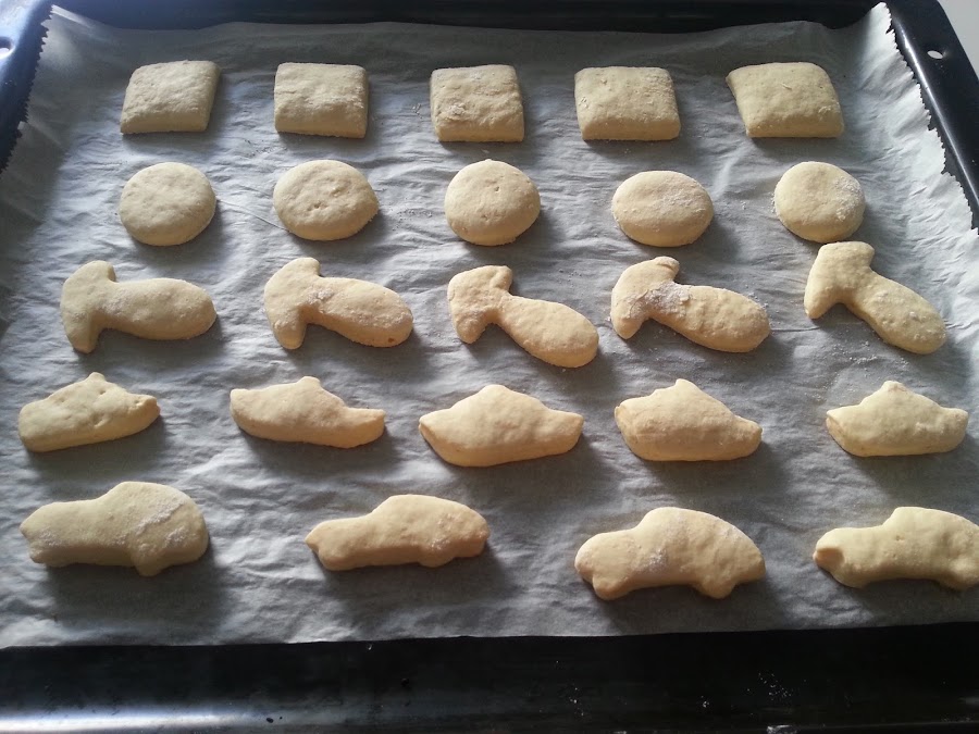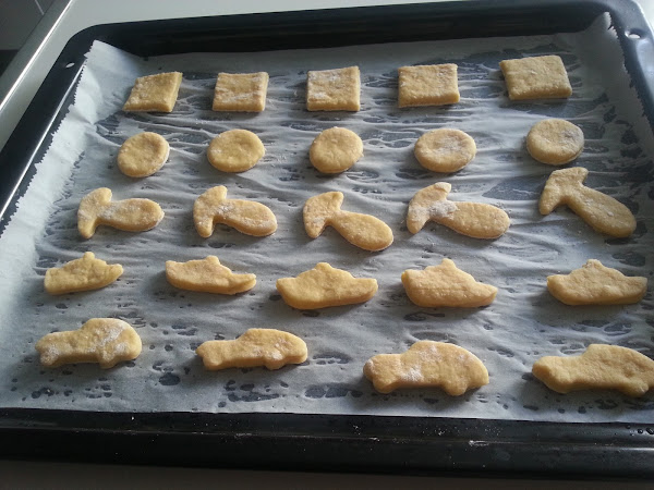 4. - La extendemos sobre la encimera enharinada y vamos cortando a nuestro antojo, yo hice circulos, cuadrados y figuritas variadas.