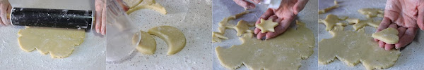 La estiramos con el rodillo a un grosor de unos 8 mm. Con cortadores de galletas vamos cortando de diferentes formas, estrellas, corazones medias lunas...