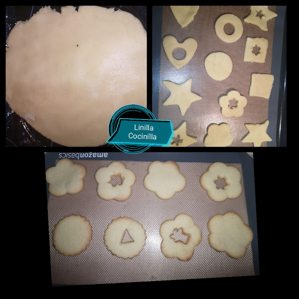 3. Extienda la masa dejándola un poco gruesa (5 mm aprox. Con cortapastas, corte figuras (si quiere de diferentes formas) y utilice otro cortapastas más pequeño para recortar el centro de la mitad de las figuras. Colóquelas en las bandejas de horno preparadas. Hornee durante 10-12 minutos (180ºC).