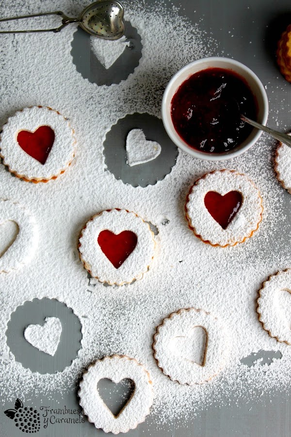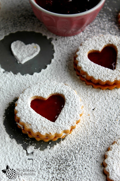 10. Ya sólo queda decorarlas como más os guste. Para hacer las de las fotos: cogemos las galletas con el corazón, las impregnamos bien de azúcar glass por su cara externa, untamos mermelada en las galletas sin corazón y las unimos