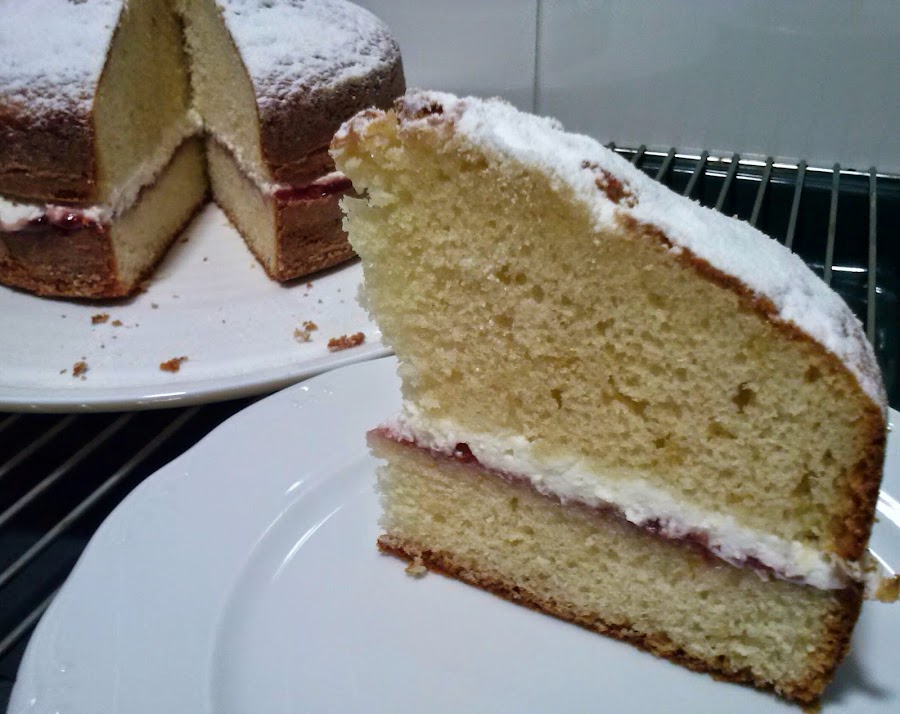 A continuación, cogemos la mitad de la parte de abajo del bizcocho y le untamos mermelada de fresas y sobre ella la nata montada (crema de leche), lo tapamos con la otra mitad y espolvoreamos por encima con azúcar glass.