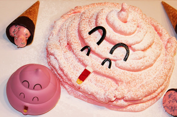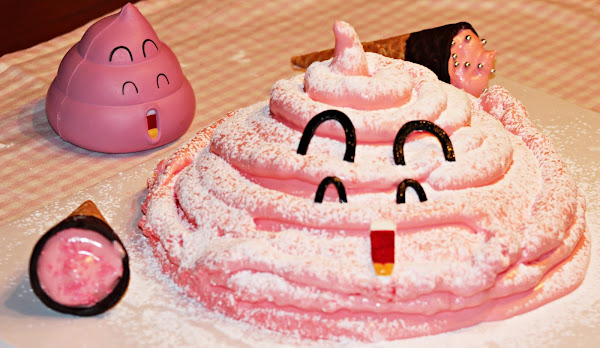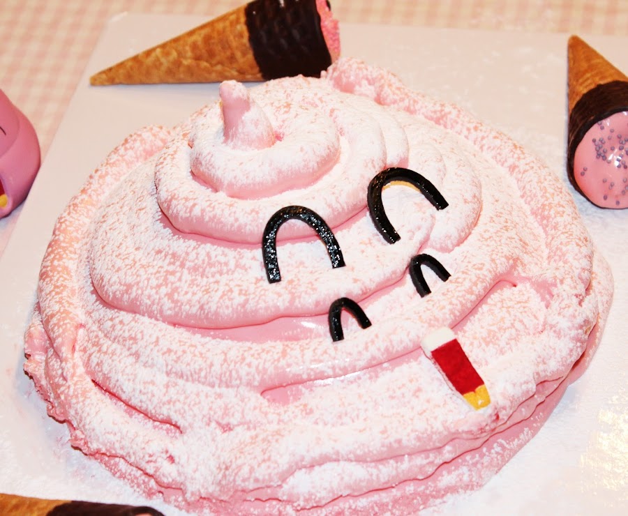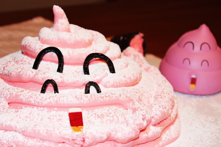 Por suerte, 2 días antes de hacer el bizcocho se me encendió la bombilla y decidí hacer una caquita rosa, concretamente la caca de Arale, y es que en el baño tengo esta caquita tan divertida que me regaló un día mi marido.