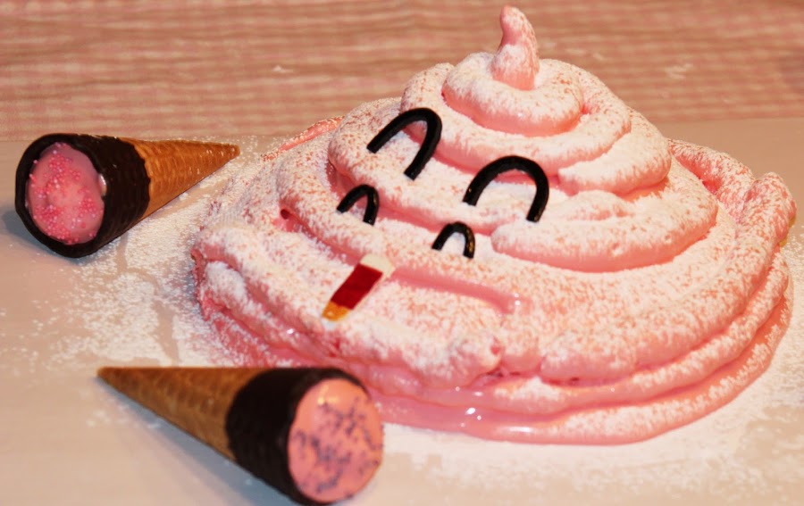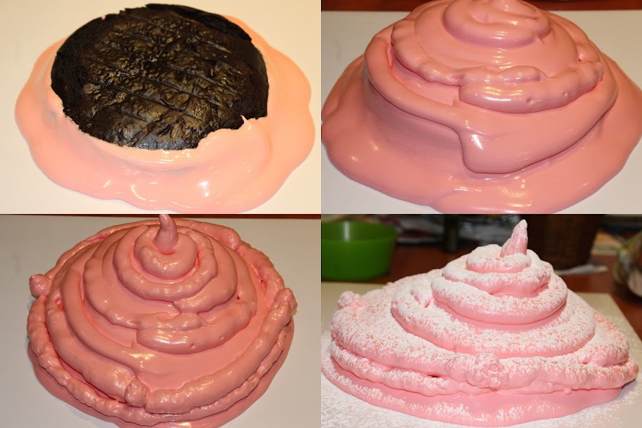 El resultado no es perfecto pero sin duda logré darle forma de caca y con el azúcar glas conseguí disimular los defectos. Con fondant hice los ojos, cejas y boca.