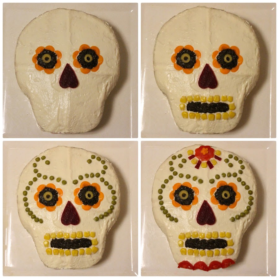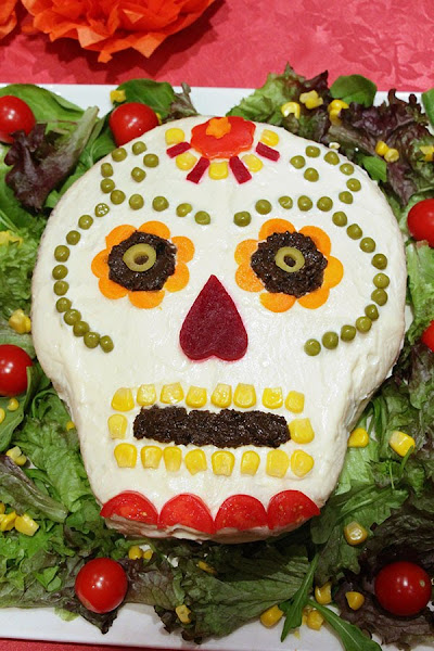 Empecemos con un pastel salado de Catrina, la popular calavera que se usa en México para celebrar del Día de Muertos, un calavera muy decorada, en nuestro caso con verduras.