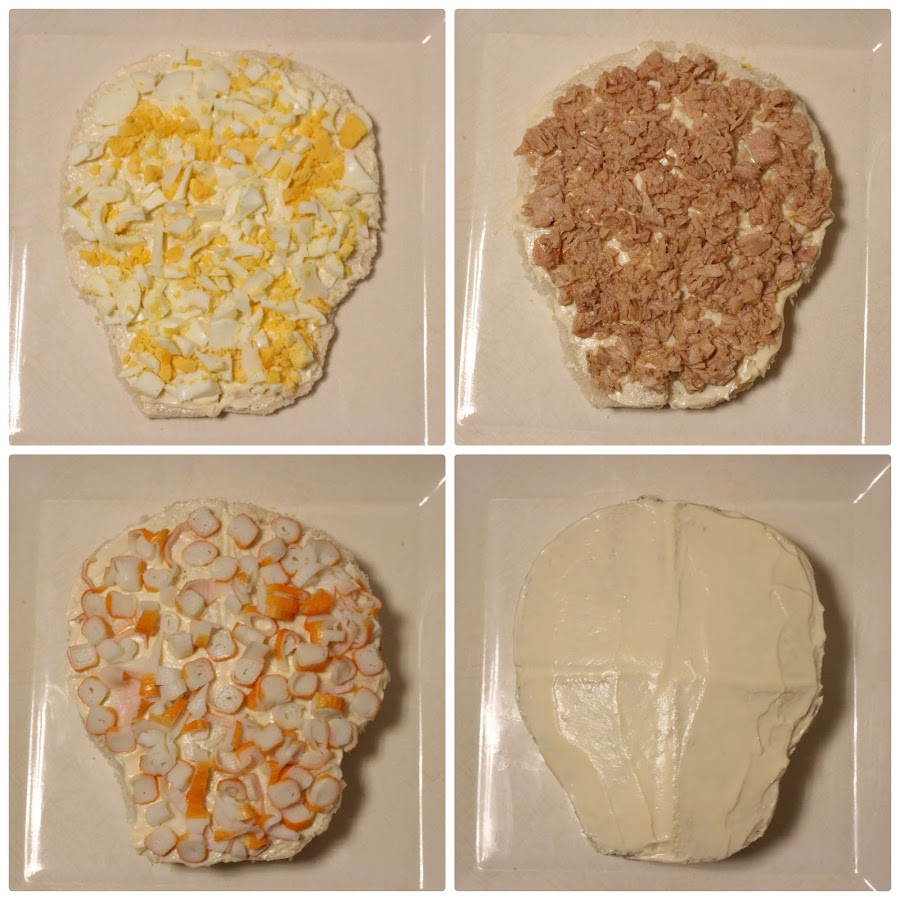 Untar la primera capa de pan de molde con mayonesa y poner huevo duro cortado en trocitos pequeños. Poner la segunda capa de pan de molde, untar con mayonesa y poner atún. Agregar otra capa de pan, mayonesa y palitos de cangrejo cortado en rodajitas pequeñas. Y acabar con la última capa de pan untada con mayonesa, alisándolo todo para que quede uniforme.