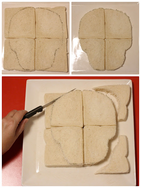 Primero toca cortar el pan de molde con la forma de la calavera, para ello sacamos de internet una plantilla de calavera y la colocaremos encima de cuatro rebanadas de pan de molde, con un rotulador comestible marcamos el borde y con un cuchillo recortartemos el sobrante.