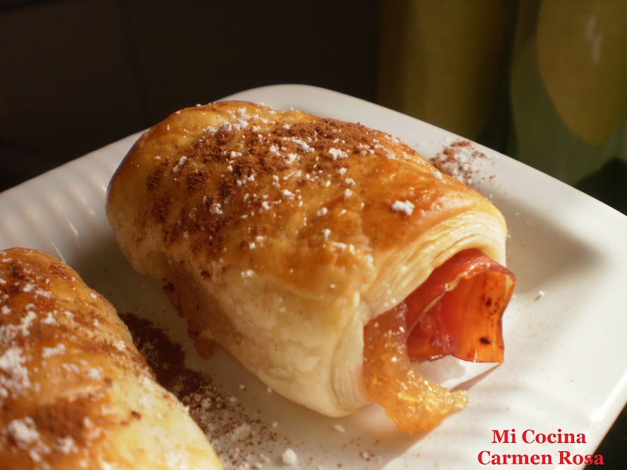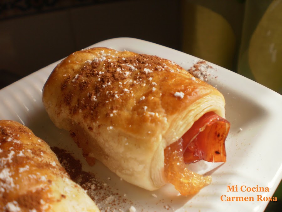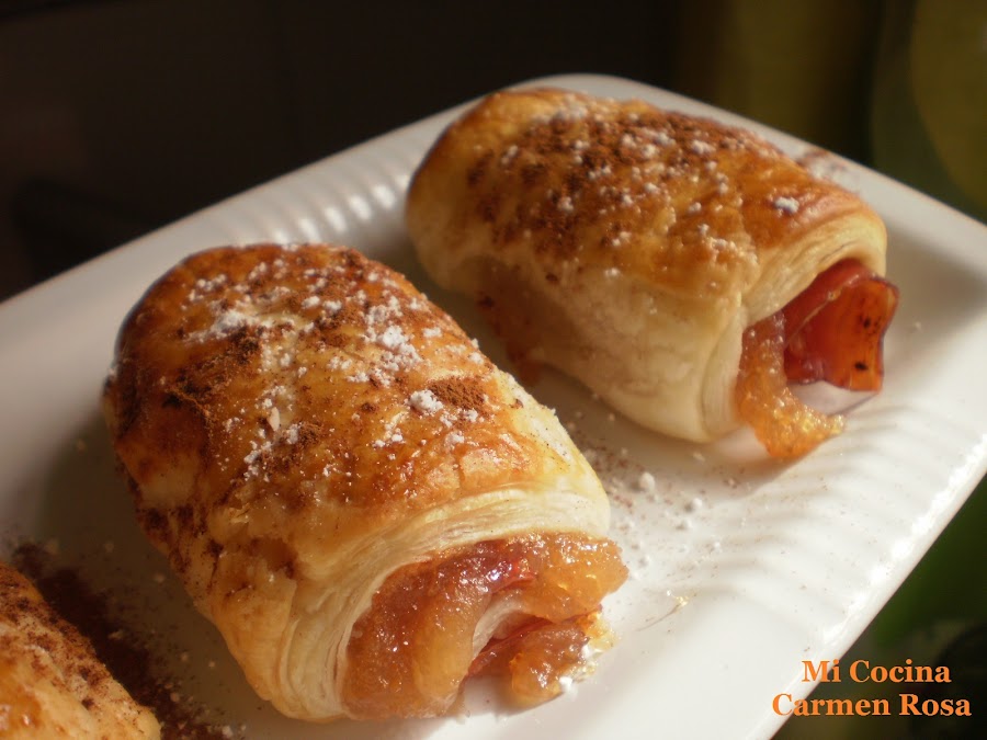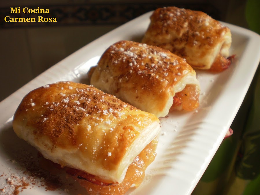 Echar una capa de cabello de angel y encima el jamón serrano. Cortar trozos de forma que al enrollarlos el hojaldre de una vuelta.