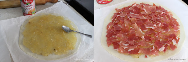 Encima ponemos las lonchas de jamón, enteras o partidas en trozos, como más os guste. Yo las he partido en trozos.