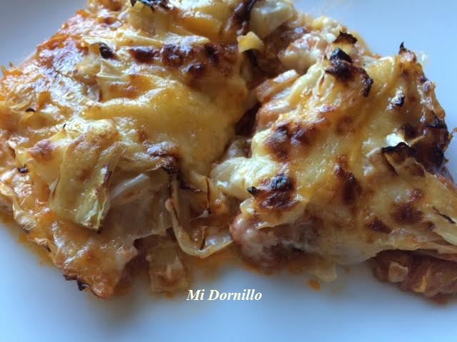 Montamos nuestro pastel, poniendo en una bandeja de horno en este orden : una capa de col, después el refrito de la carne, 4 quesos rallado, el reto de la col y cubrimos con bien de queso rallado parmesano.