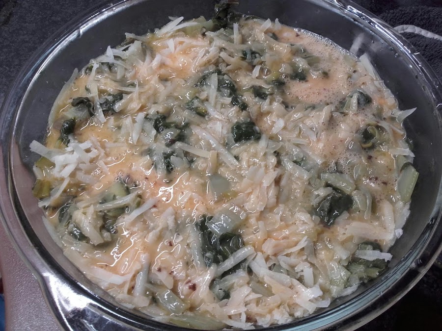 Cubrimos con los huevos batidos, aplastando un poco para que caiga entre las acelgas y el queso.