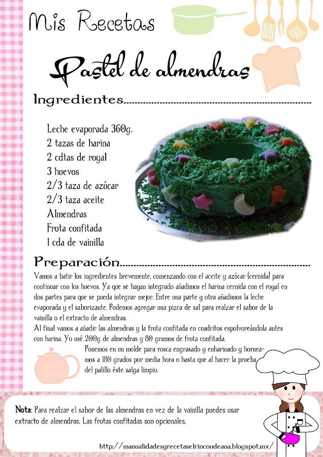En esta ocasión yo hice un pastel con almendras y esencia de vainilla, aunque para que tenga un favor más notorio puedes sustituir con extracto de almendras. Como quería darle un toque navideño la combiné con la tradicional de frutos secos de mi mamá poniéndole frutas confitadas, en fin me encanta combinar y crear nuevos sabores.