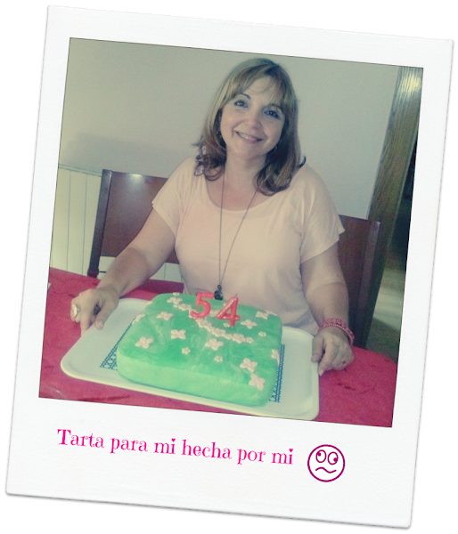 De esta última tarta no hice fotos adecuadas, todavía no tenía el blog, así que en todas salgo yo ;). La hice con restos de fondant de la tarta de mi hijo, mezclando el fondant verde y el blanco. El rosa de las florecitas es lo que me sobró de la piel del futbolista :D