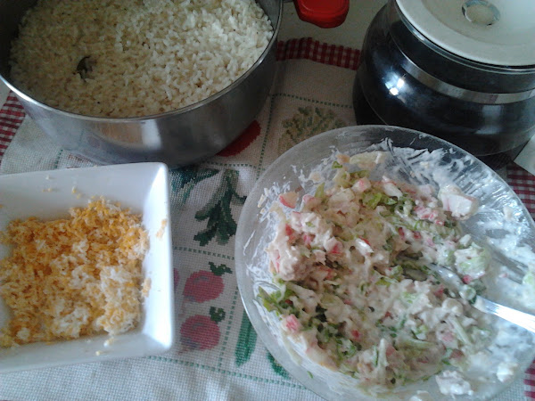 Para cocer el arroz, lo rehogamos primero con 2 cucharadas de aceite, salpimentamos al gusto y cubrimos con el doble de agua, añadimos la pastilla de caldo y dejamos cocer. Revolvemos de vez en cuando para que suelte el almidón. Dejamos enfriar.
