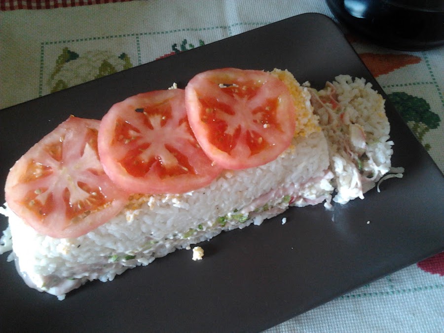 Recubrimos un molde con papel film o aluminio y ponemos la mitad del arroz, lo aplastamos bien que quede compacto, ponemos 3 lonchas de jamón, después el "mondongo" de lechuga, otras 3 lonchas de jamón y cubrimos con el resto de arroz, bien apretado.