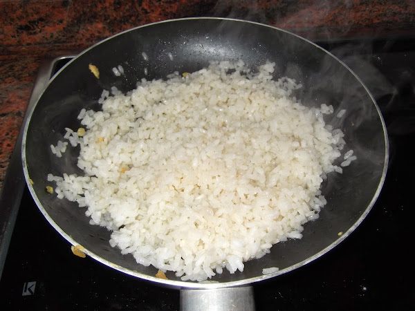 Cocemos el arroz con agua y un poco de sal y lo ponemos a escurrir. El siguiente paso es echar un poco de aceite en la sartén, cortar el ajo en trocitos, añadirlo y cuando esté dorado poner el arroz y darle un par de vueltas.