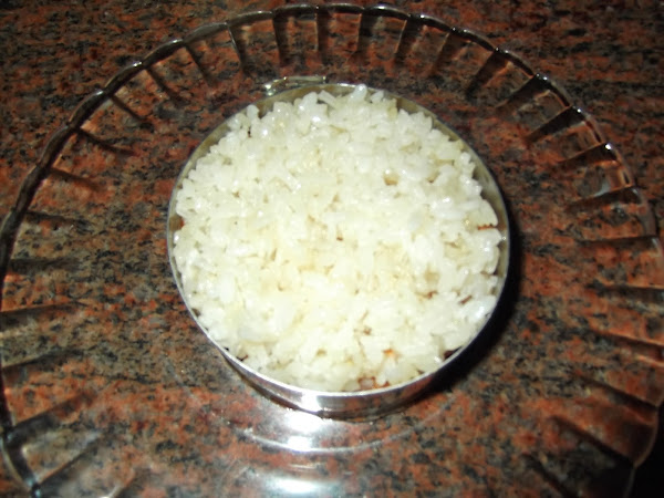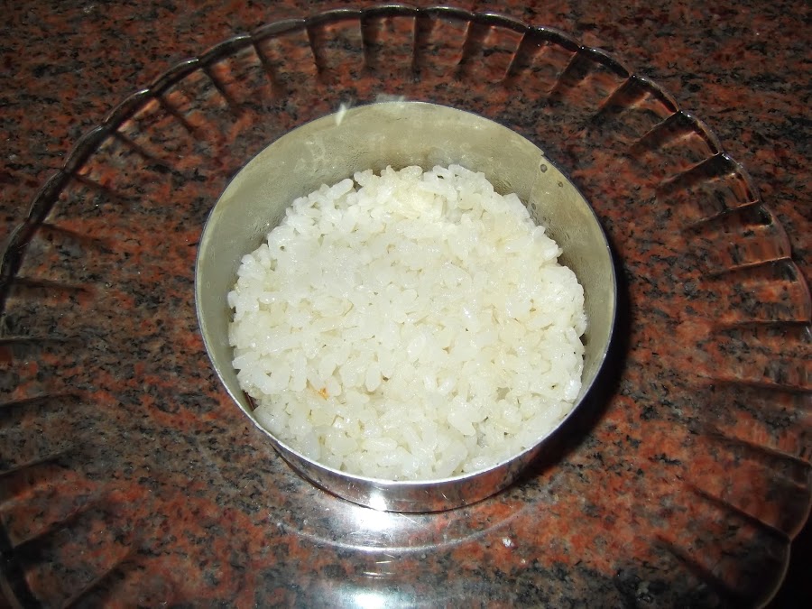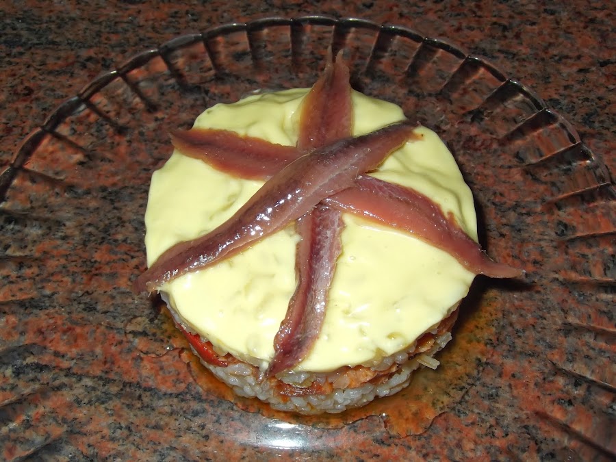 Ahora comenzamos a montar nuestro pastel, colocamos un aro para emplatar, echamos una capa de arroz, otra de la mezcla y otra de arroz. Coronamos con mayonesa y decoramos, en este caso he utilizado las anchoas sobrantes, aunque podéis utilizar trozos de pimiento o aceitunas como más os guste.