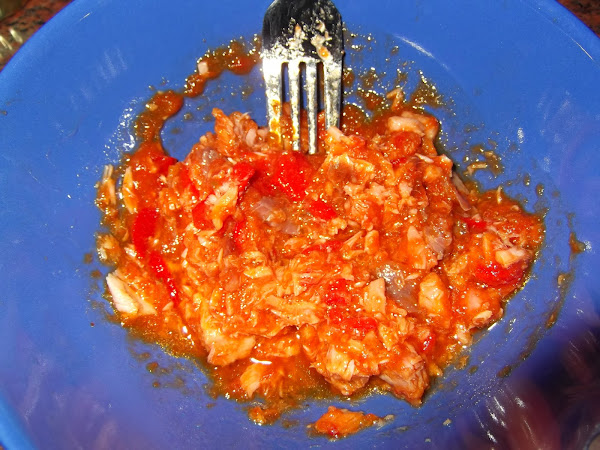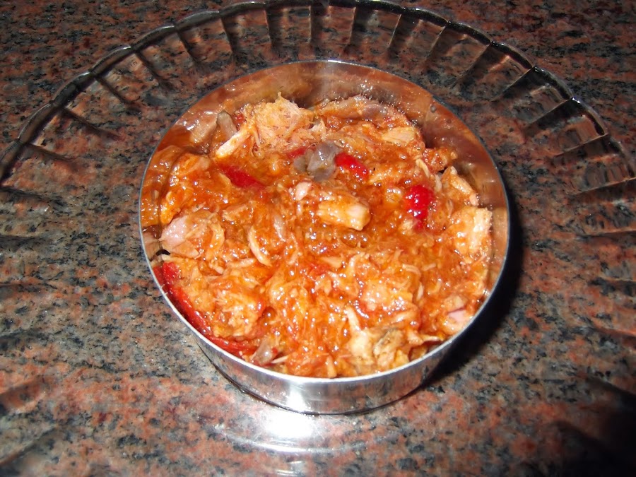 Mientras tanto vamos mezclando el resto de los ingredientes, en un bol echamos el atún escurrido, los pimientos del piquillo, parte de la lata de anchoas (nos guardamos unas cuantas para decorar) y el tomate frito. Lo revolvemos todo.