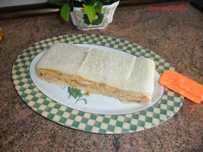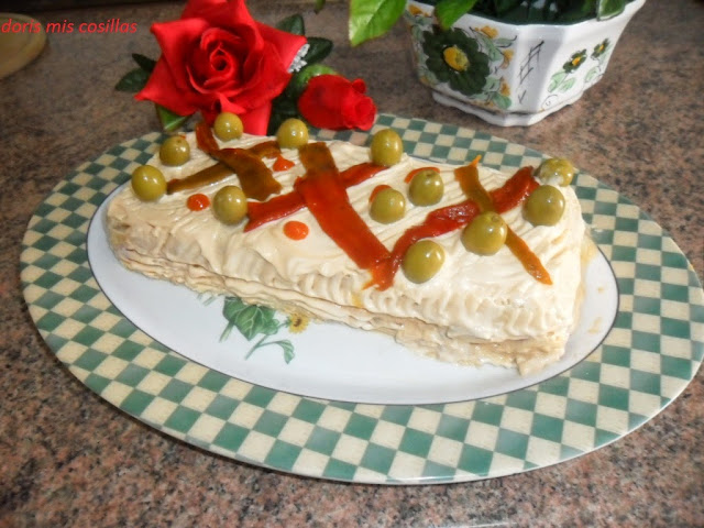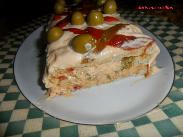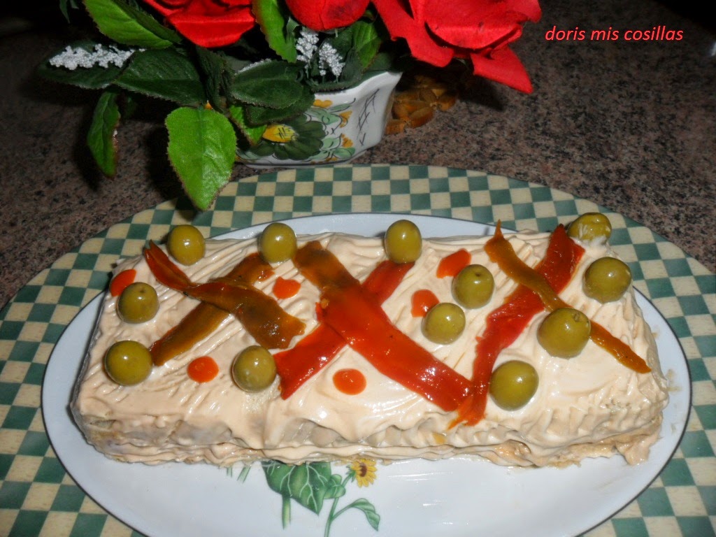 Pincelar el molde elegido con un poquito de aceite, acomodar las rebanadas de pan de molde sin corteza muy apretaditos cubriendo todo el molde. En un bol con antelación, poner abundante atún escurrido, pimientos de piquillo a tiras finas,aceitunas rellenas de anchoas cortadas a trocitos, palitos de cangrejo rallados, el huevo duro picado fino y unas cucharadas de mayonesa y un chorrito de tomate frito.Remover suavemente la preparación con una lengua de cocina.Repartimos una generosa capa encima del pan.
