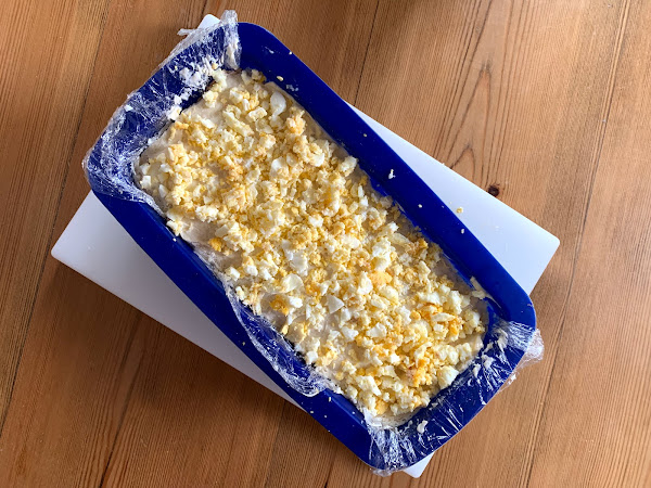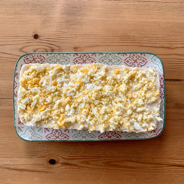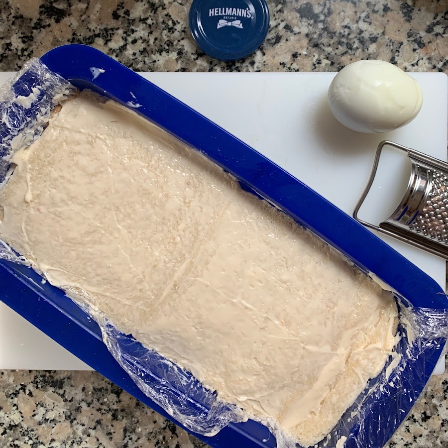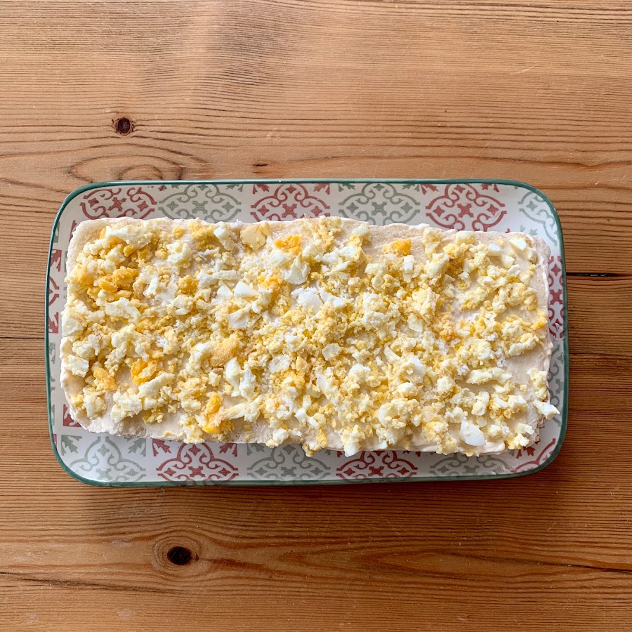 En la capa final, solamente pan de molde cubierto con mayonesa y le rallamos el tercer huevo duro encima.Cubrimos y lo dejamos en la nevera para idealmente comerlo al día siguiente.