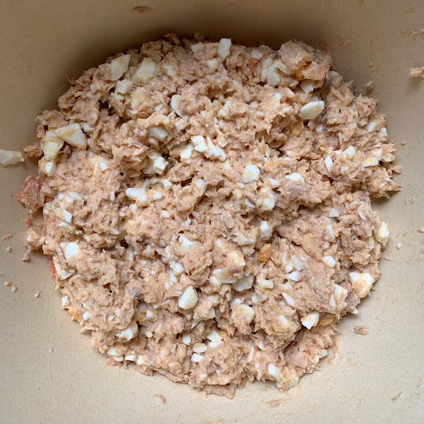 En un bol volcamos el atún con el aceite escurrido, las 2 cucharadas de tomate , 2 cucharadas de mayonesa y los 2 huevos duros cortados bien pequeños (podéis ayudaros de un tenedor para que queden bien troceados). Mezclamos todo bien.