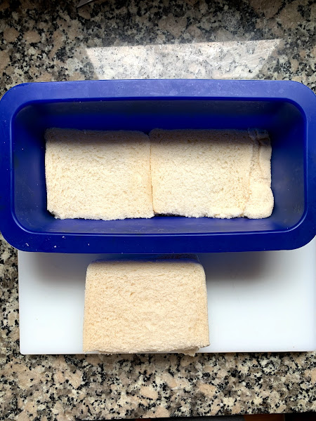 Cubrimos el interior de un molde rectangular con film transparente (nos ayudará a sacar el pastel del molde). Colocamos una capa de pan de molde que cubra bien la base, si es necesario cortamos un poco el borde para que se ajuste a la medida, si falta cubrir algún hueco, usaremos esos trocitos.