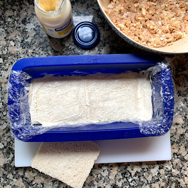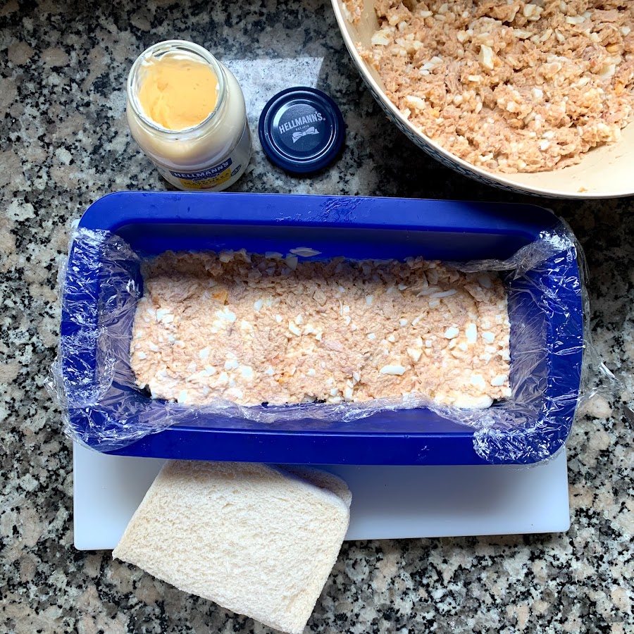 Untamos esa base con mayonesa y luego una capa de la masa que hemos hecho en el bol. Ponemos otra capa de pan de molde (presionamos), mayonesa y masa. Repetimos hasta llegar arriba del molde.
