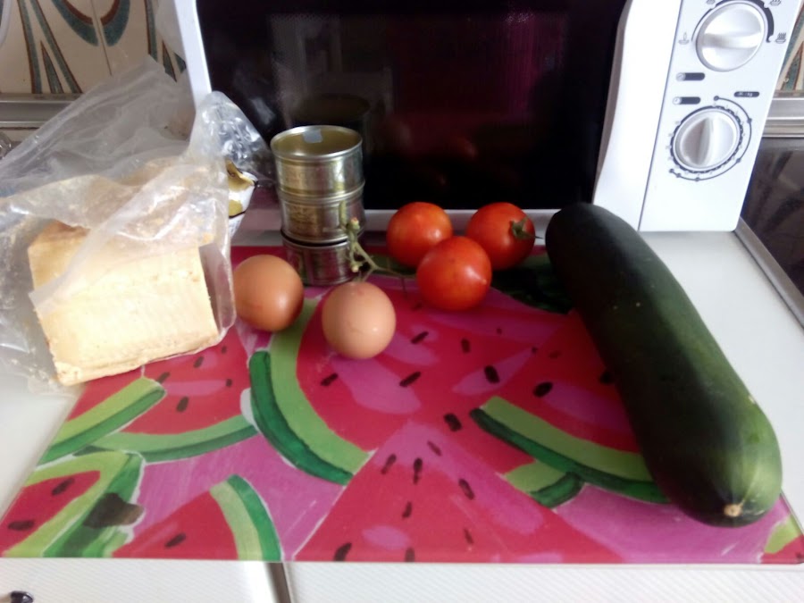 Se unta el aceite en la fuente que vayamos a emplear para realizar el pastel y que tendrá que ser resistente al horno. Luego se corta el calabacín en rodajas y se pone en el molde, seguidamente el tomate cortado en trocitos y la lata de atún, bien escurrida puede ser en escabeche o en aceite como más os guste. Se añade un poco de sal y el huevo batido por encima.