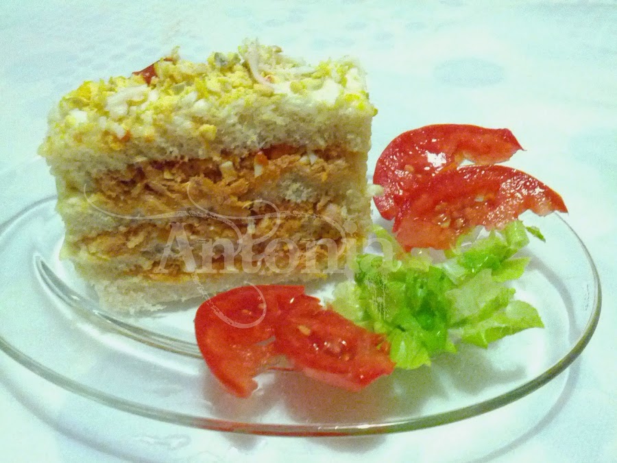 En un bol picamos unos huevos cocidos , escurrimos el atún del aceite y lo desmenuzamos con los huevos y le ponemos un poco de tomate frito , mezclamos todo bien .En un molde vamos poniendo una tanda de pan bimbo y una capa de la mezcla así hasta terminar .Cubrimos con una capa de mayonesa y adornar con huevo rallado, un pastel muy sencillito y fresquito esta muy bueno{*} {*} {*} {*} {*} {*} {*} {*} {*} {*} {*} {*} {*} {*} {*} {*}
