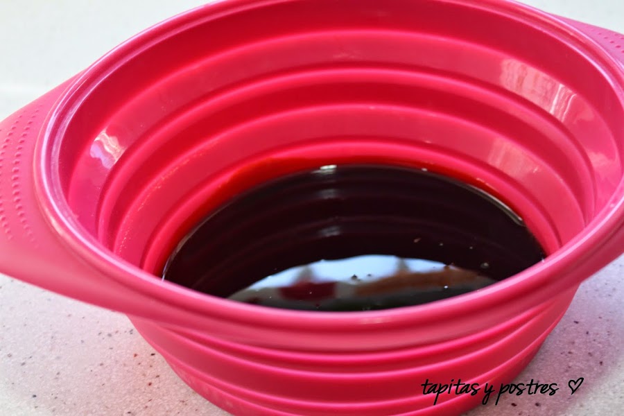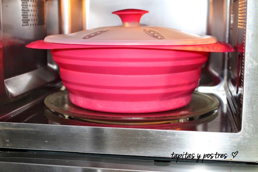 Caramelizamos un molde apto para el micro. Yo uso este de silicona que tiene tapa, pero uno de cristal con film transparente nos sirve igual.