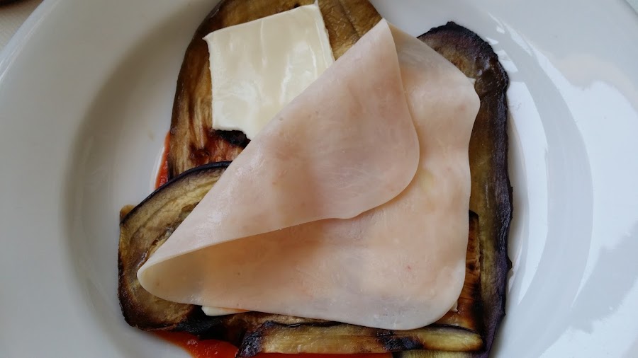 Seguidamente ponemos 2 lonchas de queso y una loncha de pavo y repetimos la misma operación volviendo a poner un poco de salsa de tomate, berenjena, queso y pavo y así hasta terminar con las lonchas de berenjena.