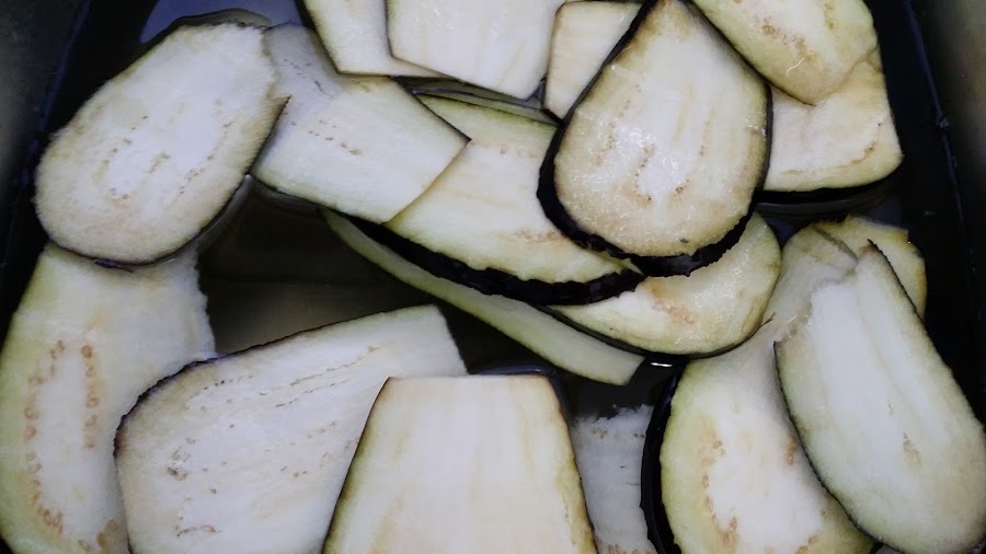 Pondremos las lonchas de berenjena en agua con sal para quitarles el amargor y que no se oscurezcan.