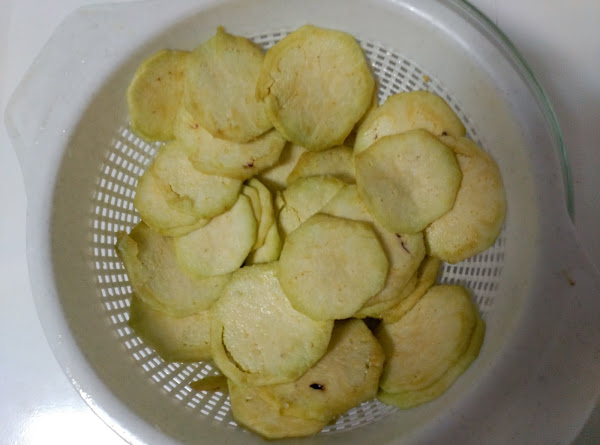 Lavar y cortar la berenjena en finas lonchas, cuanto más finas las cortes, menos aceite absorberá.