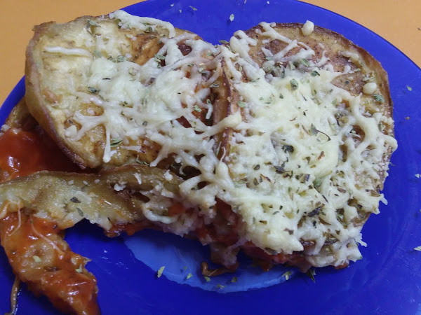 Lavamos y pelamos las berenjenas y las cortamos a rodajas. Las salamos y dejamos unos 10 minutos reposar.